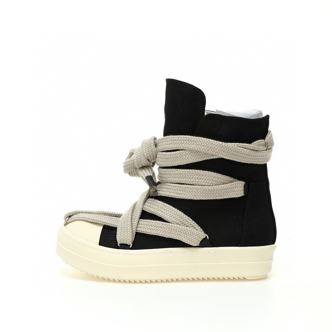 Sneaker high-top Rick Owens DRKSHDW modello Hexa in canvas nero con lacci oversize intrecciati beige/grigio. Suola platform in gomma avorio con profilo rigato iconico. Chiusura laterale con zip in argento. Include scatola originale Rick Owens e tote bag in cotone verde militare. Made in Italy.